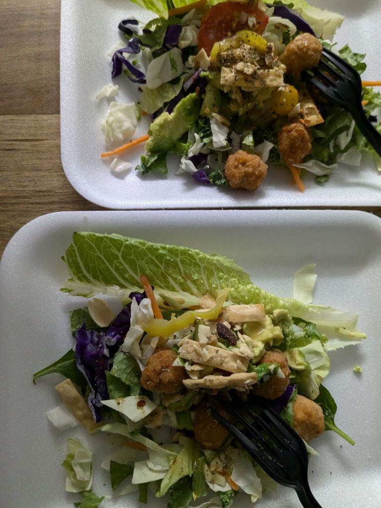 Salad with chicken bites, romaine, purple cabbage, spinach and other goodies are awesome. Thank you for reading.