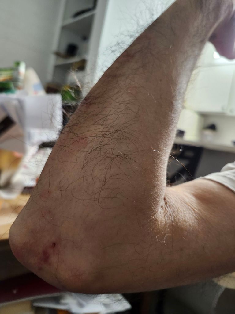 Well, one evening, when the sun was going down. I decided to walk to Whole Foods from my apartment. Since I needed some more pears and yogurts. While I saw the sun going down and the sun was in a full sunset. I happened to come upon a dog without a leash. The dog jumped up and bit me on the right elbow.
