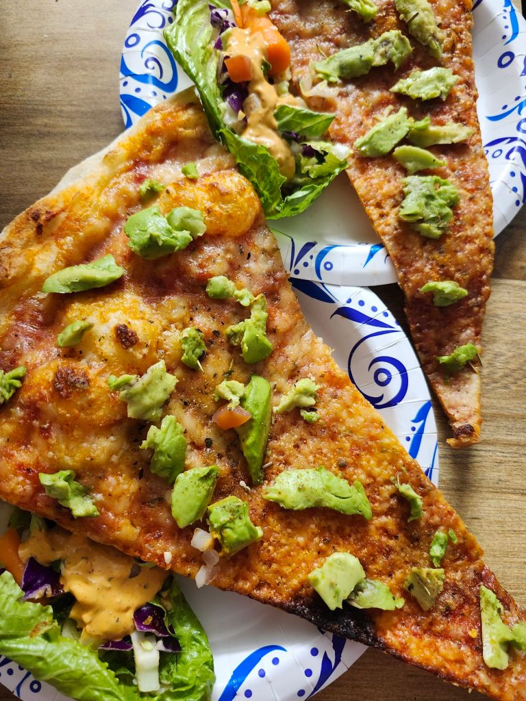 This cheese pizza with avocado was really delicious. The avocado made the piece of pizza even more special, and the salad was an extra bonus. So it was another killer dinner.