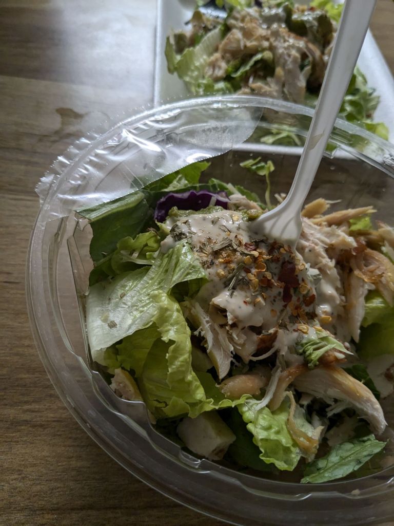 This salad hit the spot with tomato, apple, broccoli, spinach, chicken, pita bread,and romaine. There were also some spices on it that made the salad better. It was really tasty.